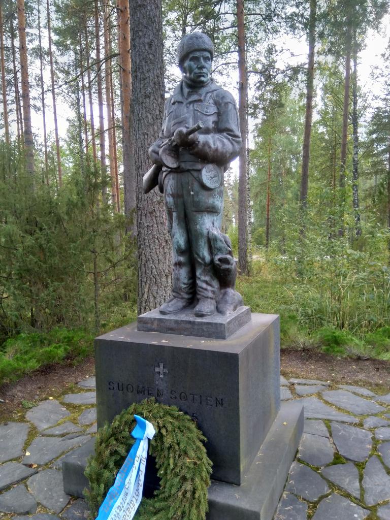 Kuvassa Rajamies-patsas, joka on suurennos kuvanveistäjä Alpo Sailon 1944 Itä-Karjalassa Vuokkiniemessä tekemästä n. puolen metrin kipsisestä Partiomies-patsaasta, jossa mallina oli RjP 8:ssa palvellut kuusamolainen rajakorpraali Väinö Karjalainen.